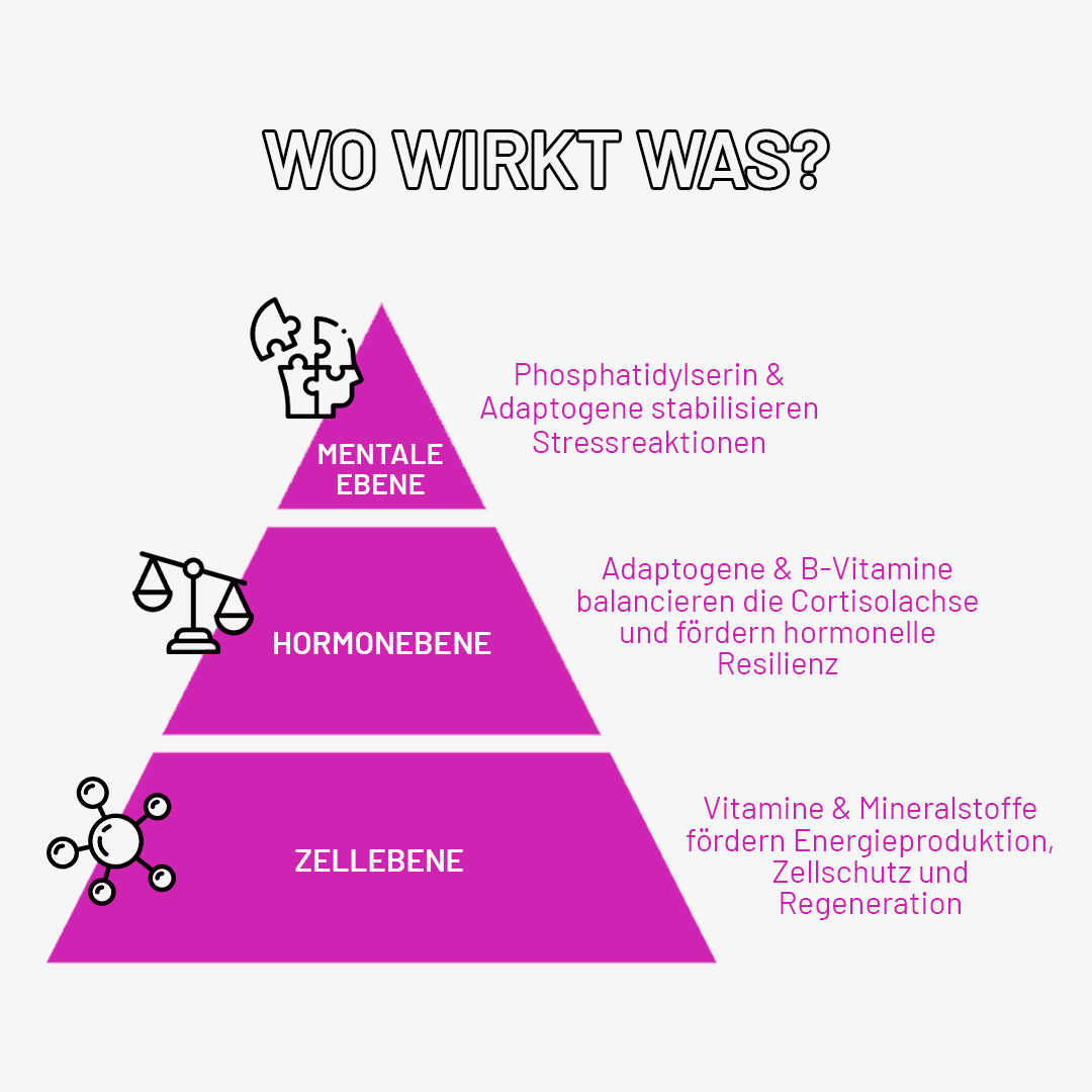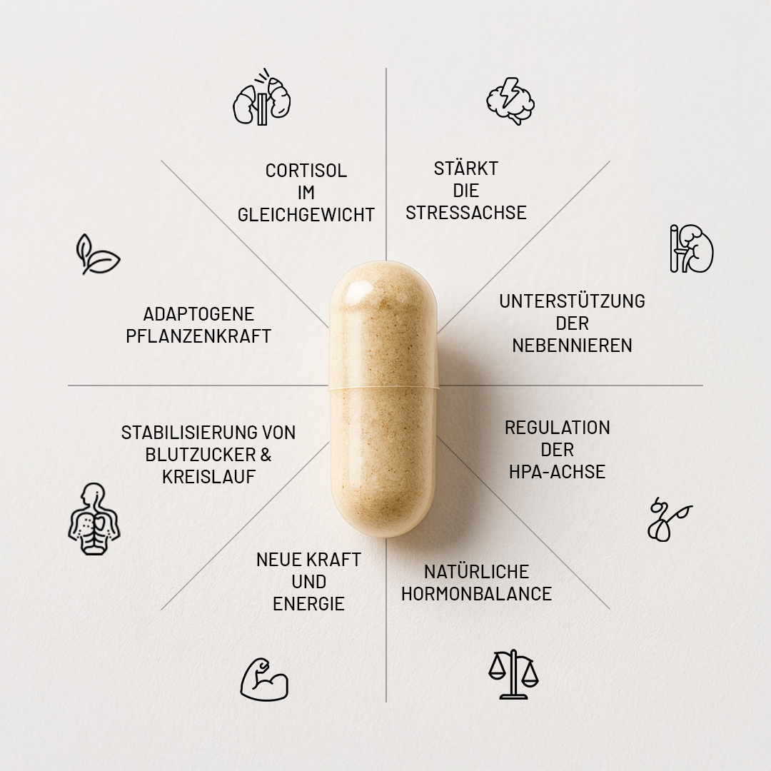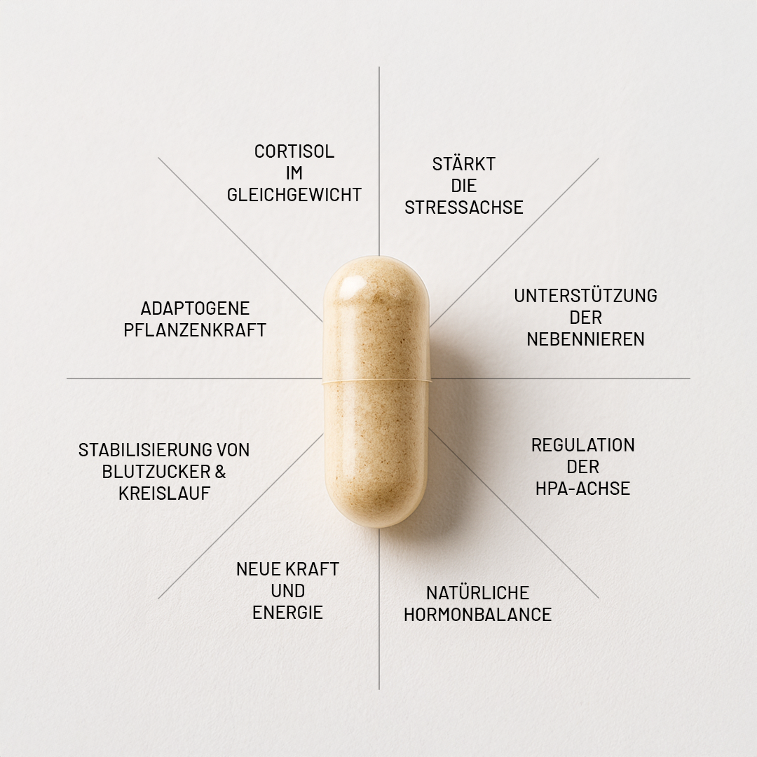 Diese Kombination unterstützt Energieprozesse, Stressanpassung, mentale Klarheit und das Nervensystem, ohne in überzogene Wirkversprechen zu gehen.
