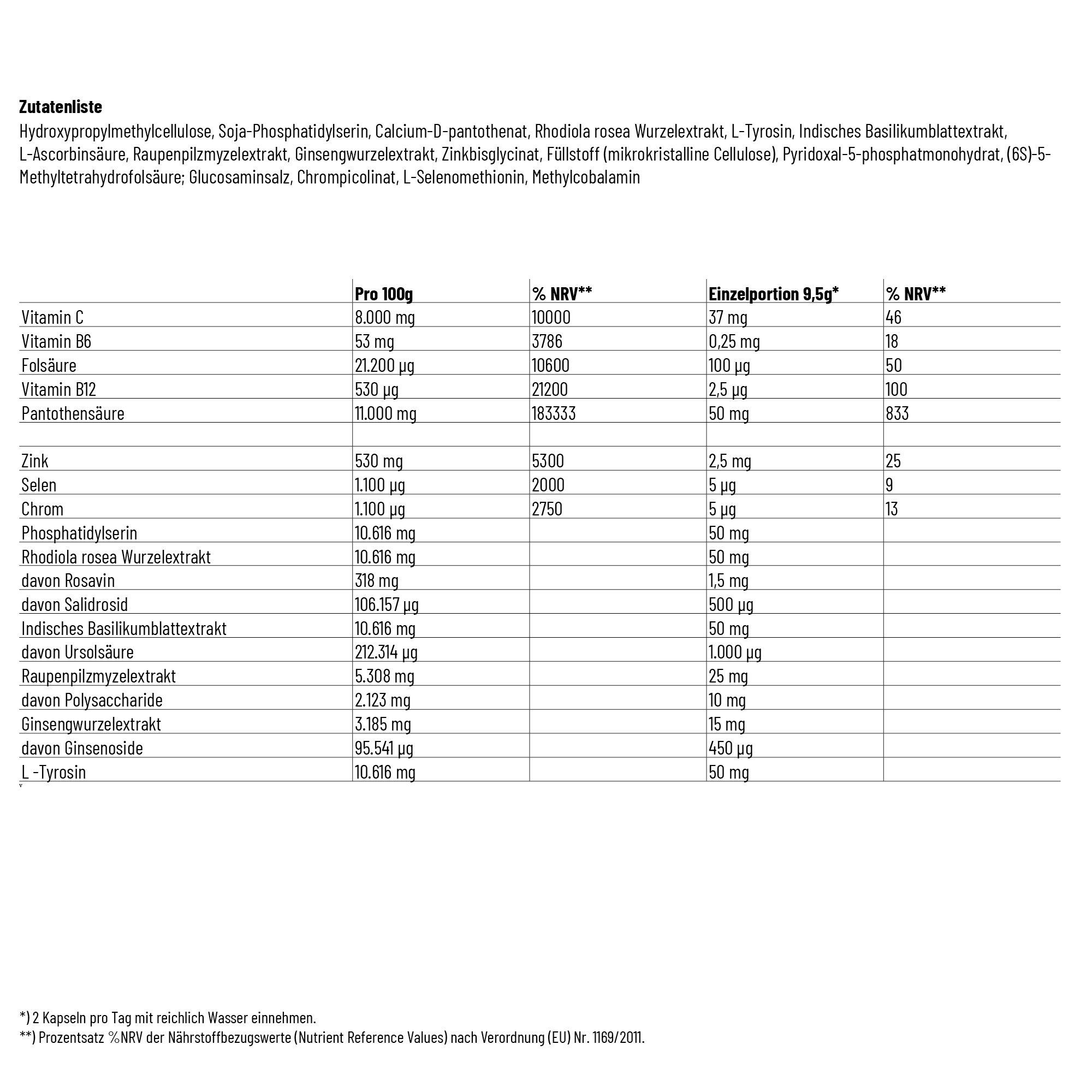 Hydroxypropy/methylcellulose, Soja-Phosphatidylerin, Calcium-D-pantothenat, Rhodiola rosea Wurzelextrakt, L-Tyrosin, Indisches Basilikumblattextrakt, L-Ascorbinsäure, Raupenpitzmyzelextrakt, Ginsengwurzelextrakt, Zinkbisglycinat, Füllstoff (mikrokristalline Cellulose), Pyridoxal-5-phosphatmonohydrat, (65)-5-Methyltetrahydrofolsäure; Glucosaminsalz, Chrompicolinat, L-Selenomethionin, Methylcobalamin