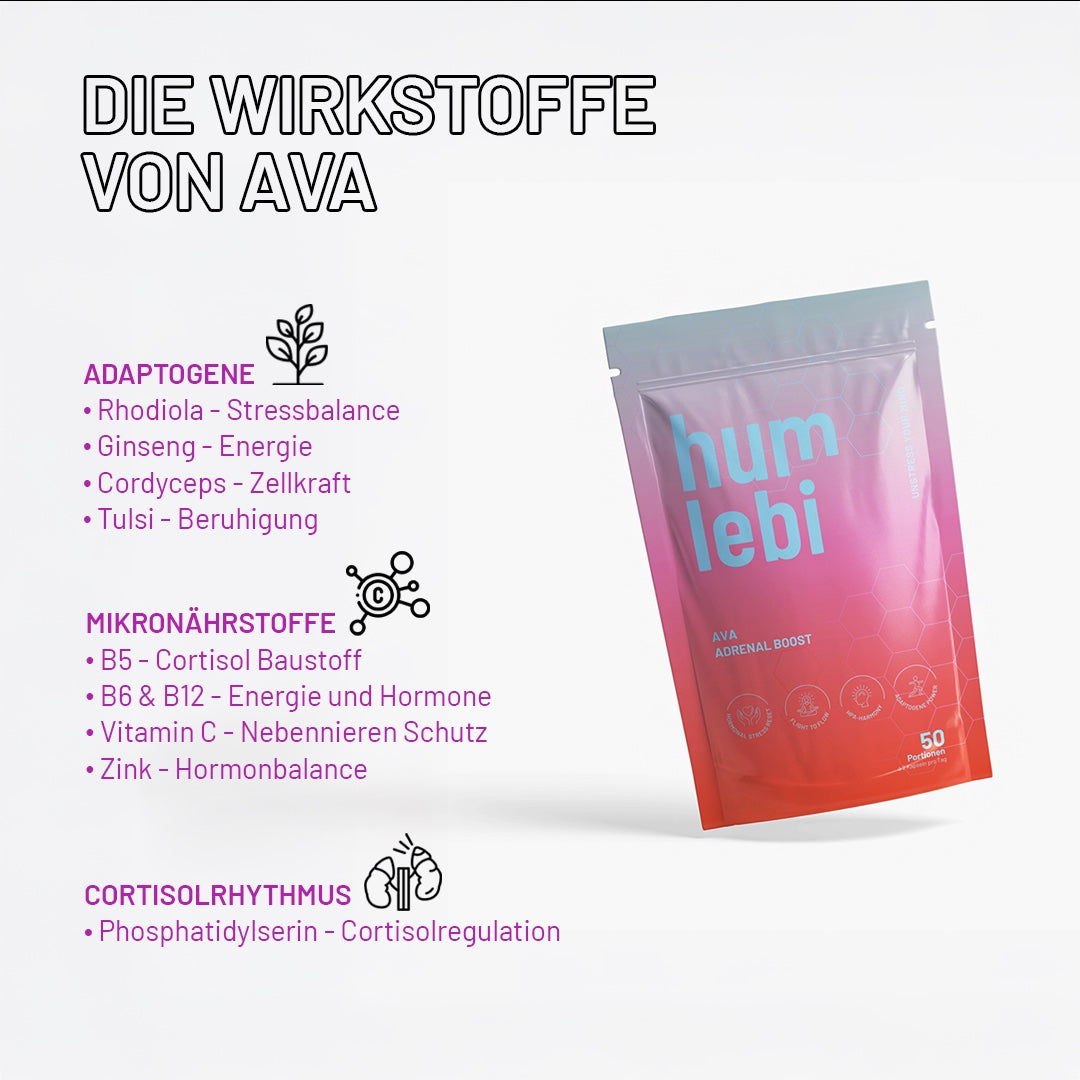 AVA® Cortisolbalance ist eine Entwicklung von humlebi by Dr. Reni – mit Ärztinnen, Psychologinnen und Biochemikern. Unser Anspruch: reine, geprüfte & transparente Produkte, die Frauen (und Männer) wirklich unterstützen.