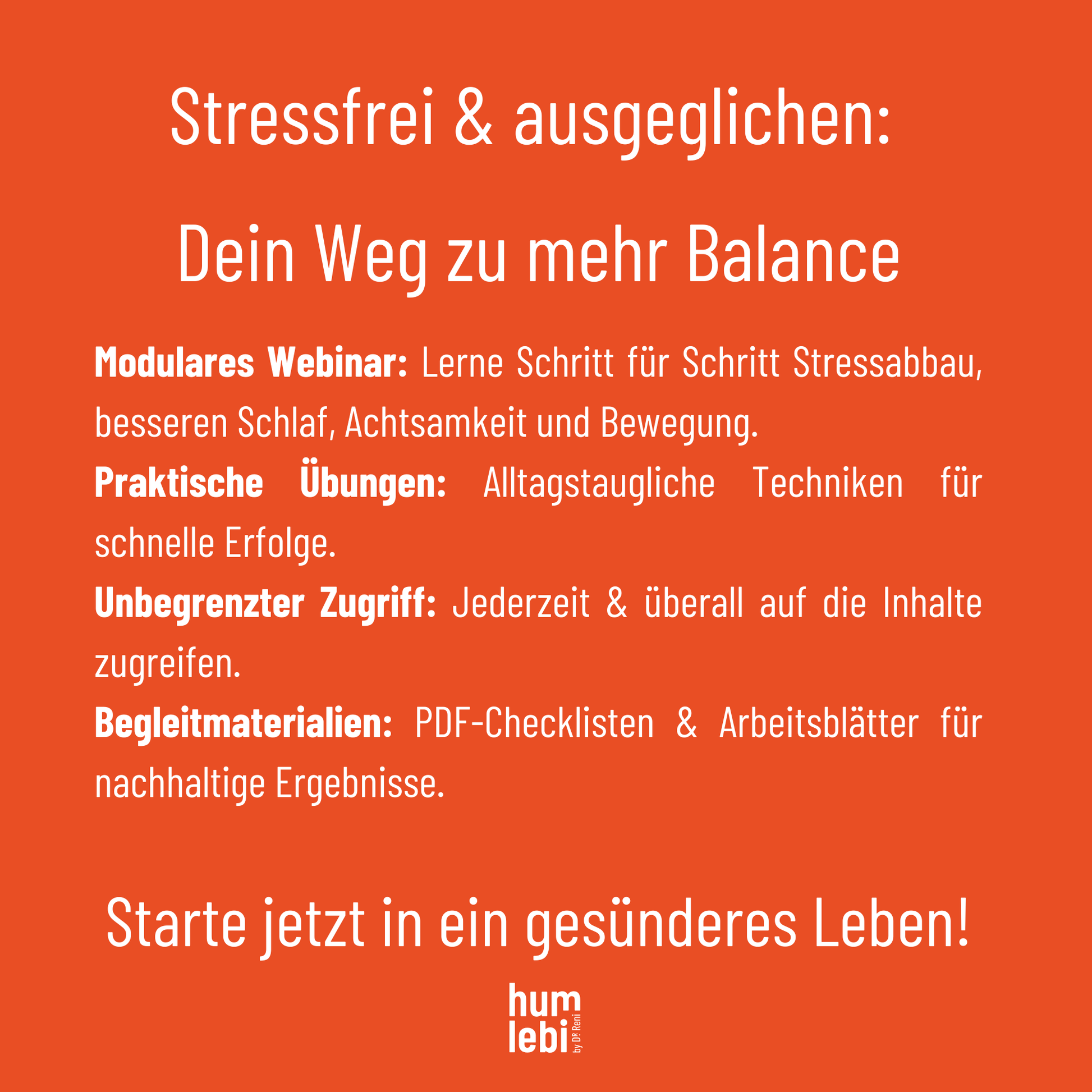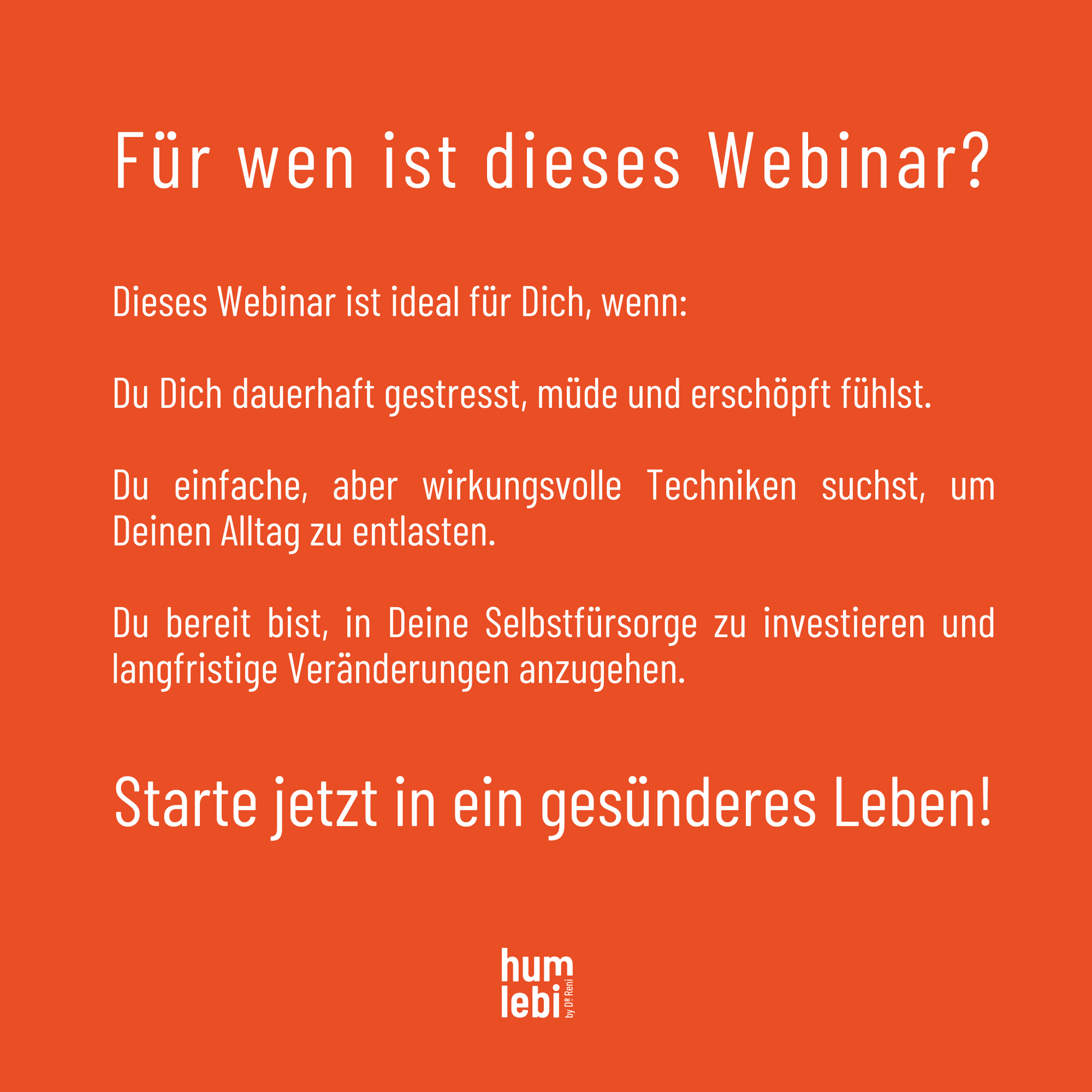 Unsere Webinare sind medizinisch-therapeutisch fundiert, von der Spezialistin Dr. Reni & ihrem Team entwickelt und basieren auf jahrelanger Erfahrung im Bereich Erschöpfung und Stressbewältigung. Sie vereinen evidenzbasierte Techniken, die Frauen helfen, aus der Erschöpfung zu finden, wieder aufzutanken und die Work-Life-Balance nachhaltig zu stärken.
